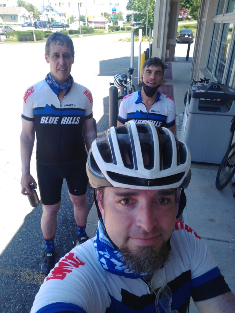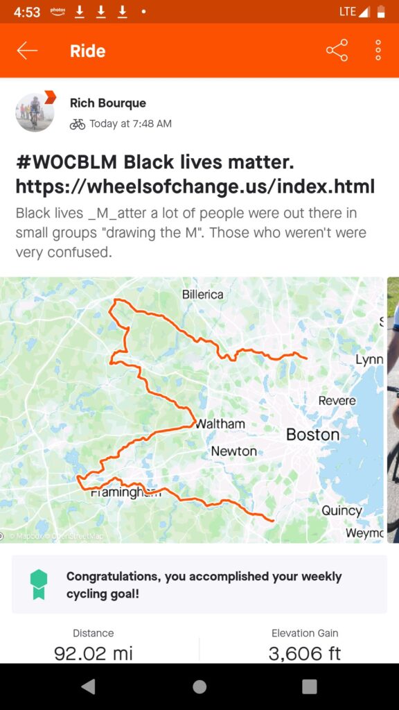 Dave, Bruce, Mark and Rich went out for a long day in the saddle to help draw “Black Lives Matter” up the coast of New England from New York up to Maine. Many cyclists were out that day adding to the heat map. They were working on the M which covered just north and west of Boston. It ended in the southern tip of Boston.